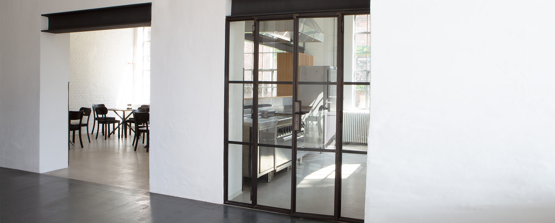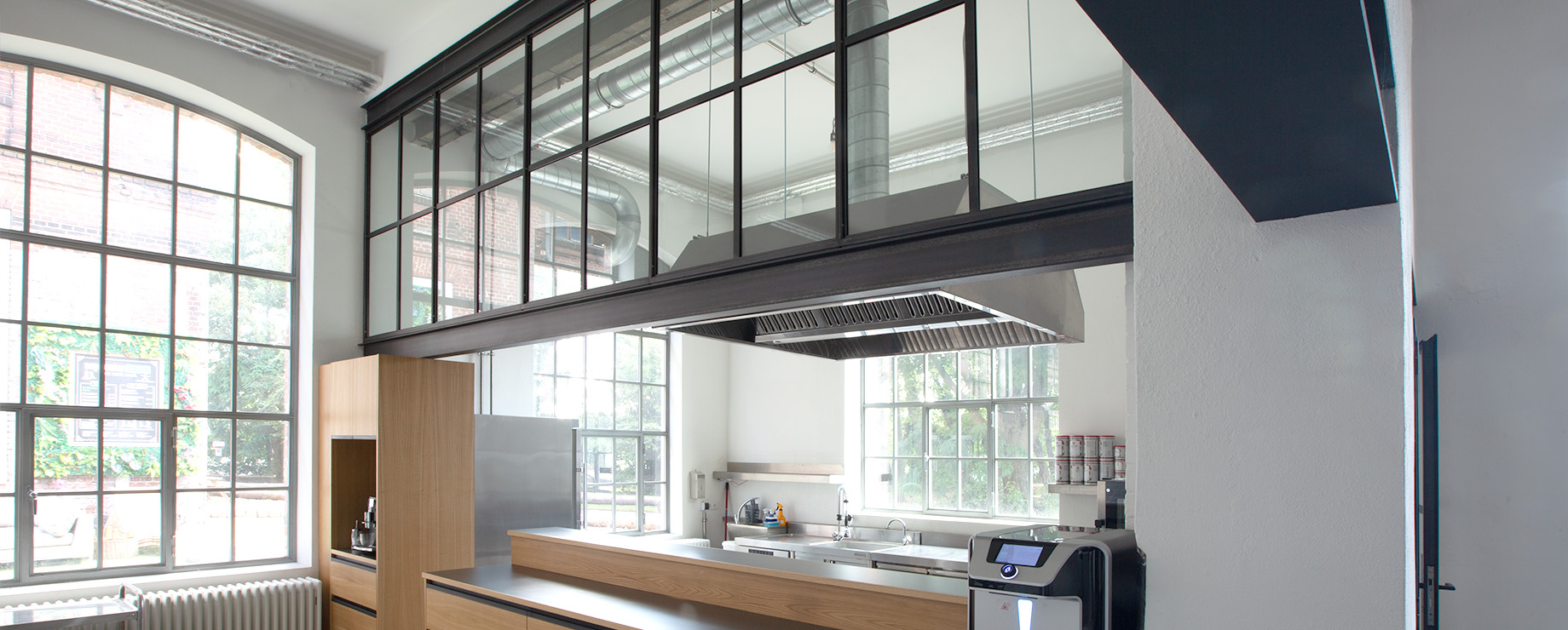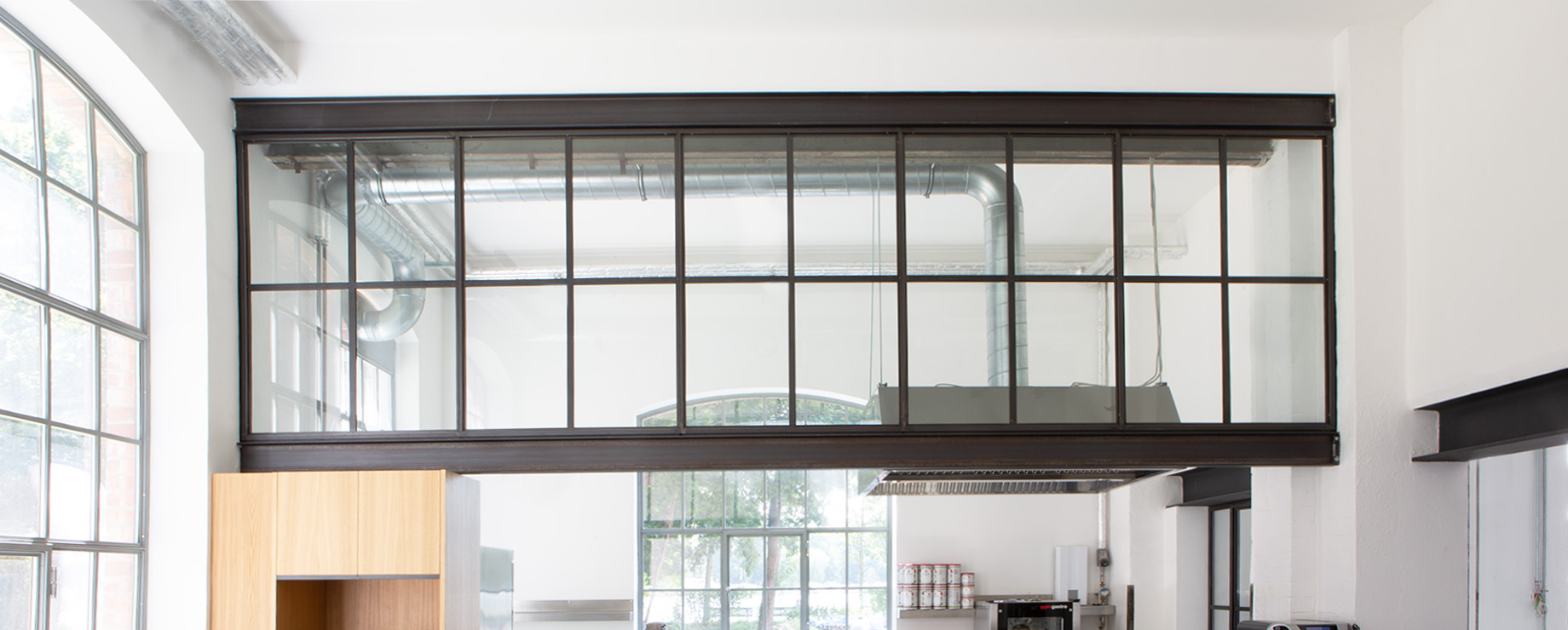 The original steel window profile M20S as a room divider with loft character in a canteen in Berlin. Minimalist slim and designed for large areas. Glazing significantly improved the acoustics and room airflow. The small face width of only 29 mm with glass dividing muntin and a profile depth of only 32 mm causes a homely ambience and is at the same time statically very stable.