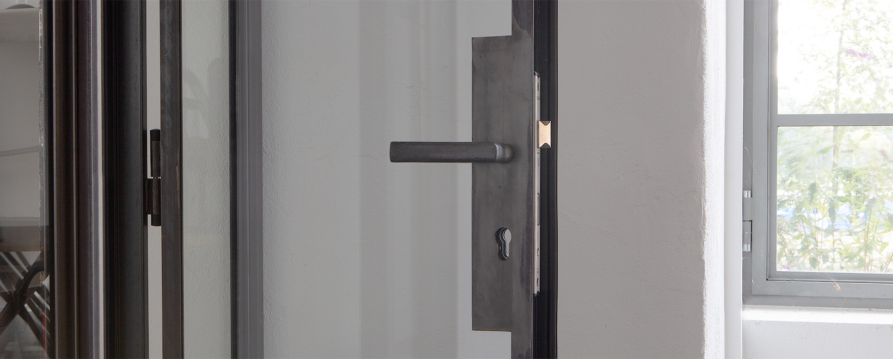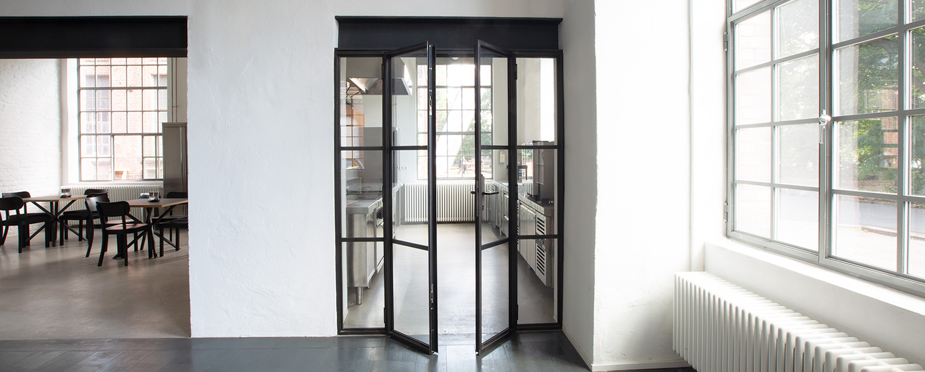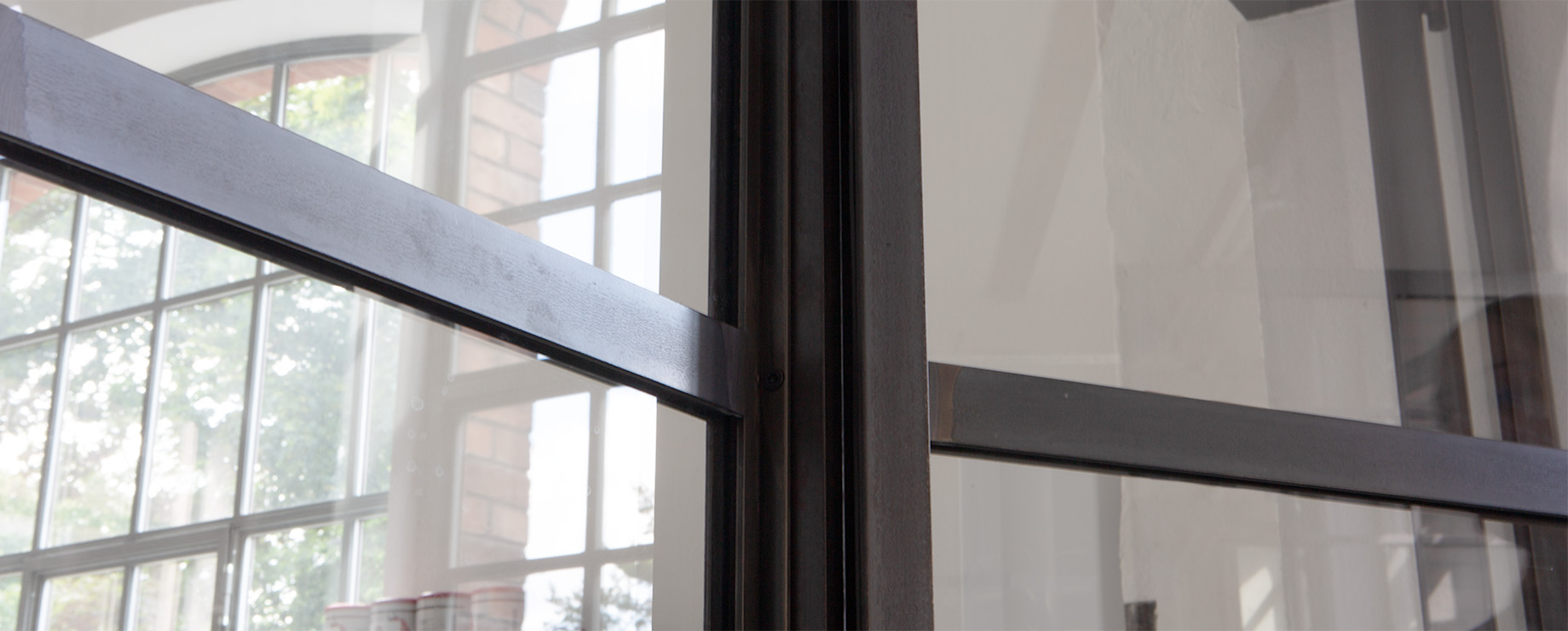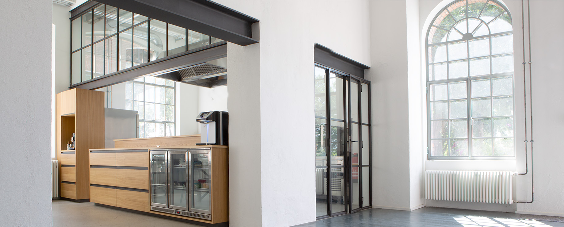 The original steel window profile M20S as a room divider with loft character in a canteen in Berlin. Minimalist slim and designed for large areas. Glazing significantly improved the acoustics and room airflow. The small face width of only 29 mm with glass dividing muntin and a profile depth of only 32 mm causes a homely ambience and is at the same time statically very stable.